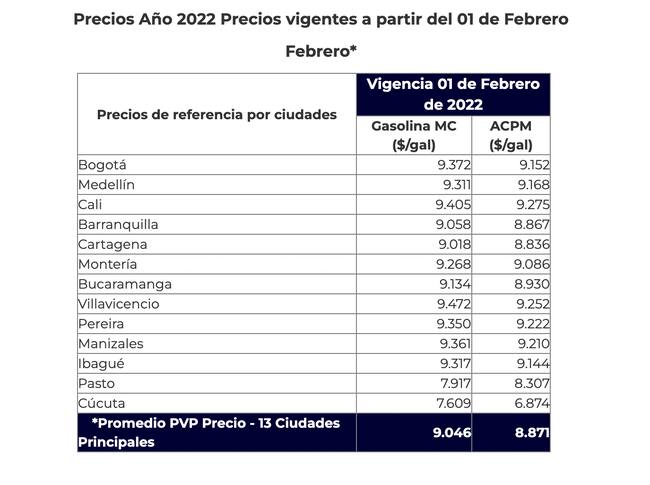 El Ministerio de Minas y Energía publicó la tabla de precios para el mes de febrero 2022 que tendrán los combustibles en las 13 principales ciudades del país, la cual fija sus valores mes a mes.