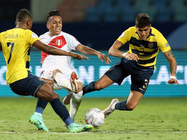 Christian Cueva de Perú junto a Pervis Estupiñan y Piero Hincapie de Ecuador / Alexandre Schneider