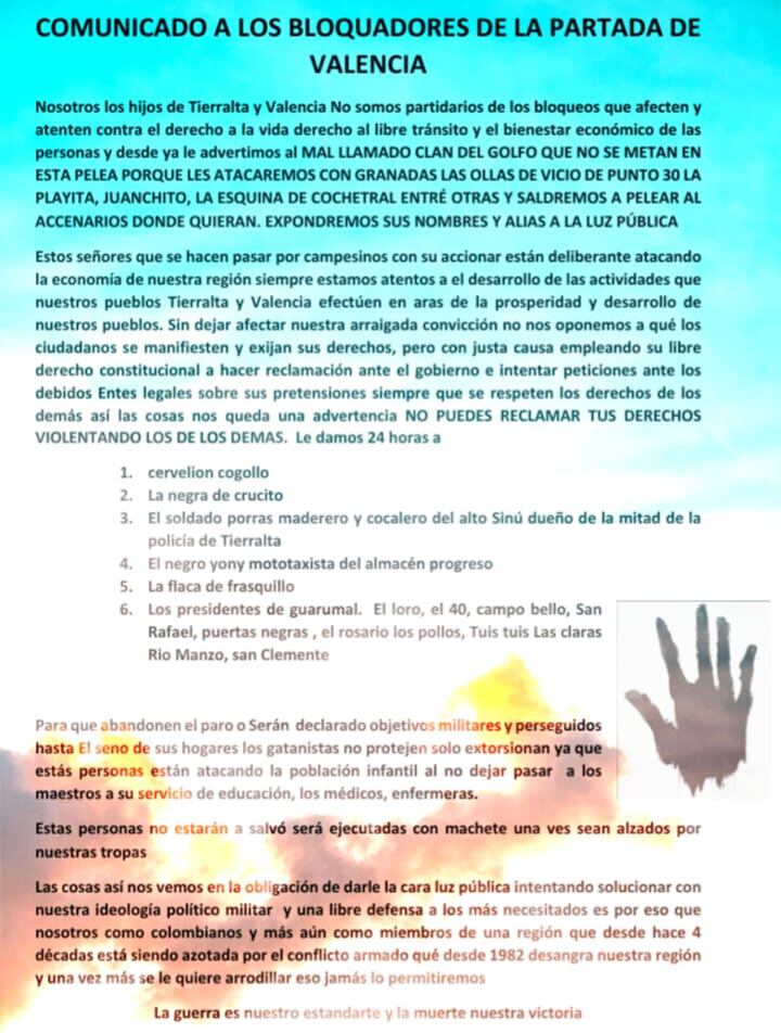 “Nos queda una advertencia: no puedes reclamar tus derechos violentando los de los demás. Le damos 24 horas a Cervelion Cogollo, La Negra de Crucito, El Soldado Porras, El Negro Yony, La Flaca del Frasquillo, los presidentes de Guarumal, El Loro, El 40, Campo Bello, San Rafael, Puertas Negras, El Rosario, Los Pollos, Tuis Tuis, Las Claras, Río Manso y San Clemente, para que abandonen el paro o serán declarados objetivo militar y perseguidos hasta el seno de sus hogares”, establece el documento intimidante.