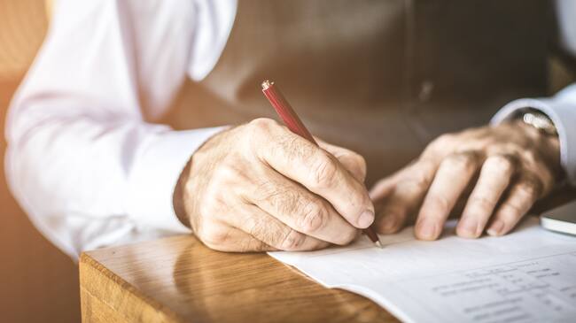 Signature. Close up image of senior businessman sign in papers. / Liderina