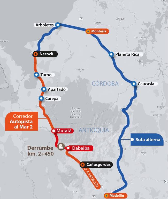 La vía cerrada es Dabeiba – Mutatá, la cual presentó un derrumbe durante este lunes. Según la Agencia Nacional de Infraestructura y la Concesión Autopistas Urabá S.A.S., el mismo se generó por las lluvias que se presentan en la zona.