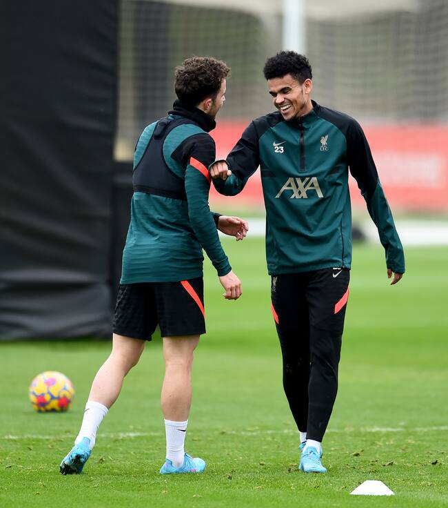 Luis Díaz y Diogo Jota en el entrenamiento del Liverpool previo al juego ante el Leicester / Andrew Powell