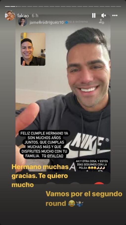 La publicación se hizo a través de historias de Instagram, en donde James subió una foto de una videollamada con Falcao acompañado de un mensaje de felicitación, pero también agregó: “en estos días seguimos con la pelea”.