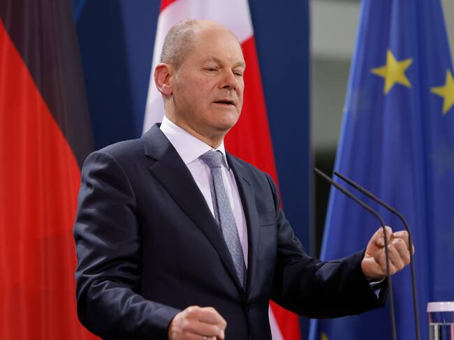 BERLIN, GERMANY - FEBRUARY 09: German Chancellor Olaf Scholz speaks to the media during a joint press conference with Danish Prime Minister following talks at the Chancellery on February 9, 2022 in Berlin, Germany. Frederiksen is in Germany for the first time since Scholz became chancellor. (Photo by Michele Tantussi/Getty Images) / MICHELE TANTUSSI