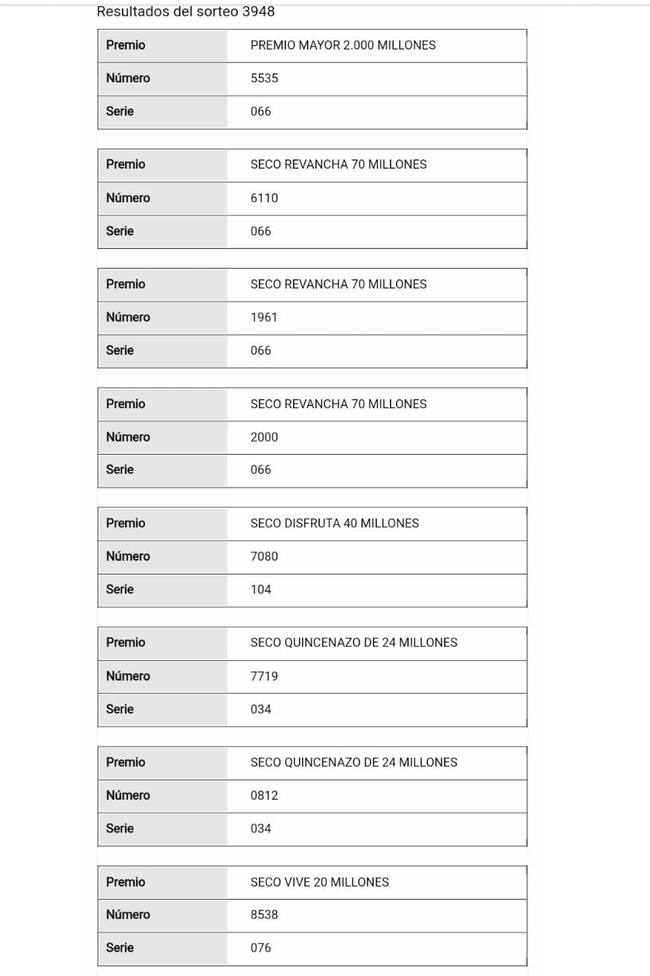 El resultado del premio mayor del sorteo 3948 es: 5535 de la serie 066.