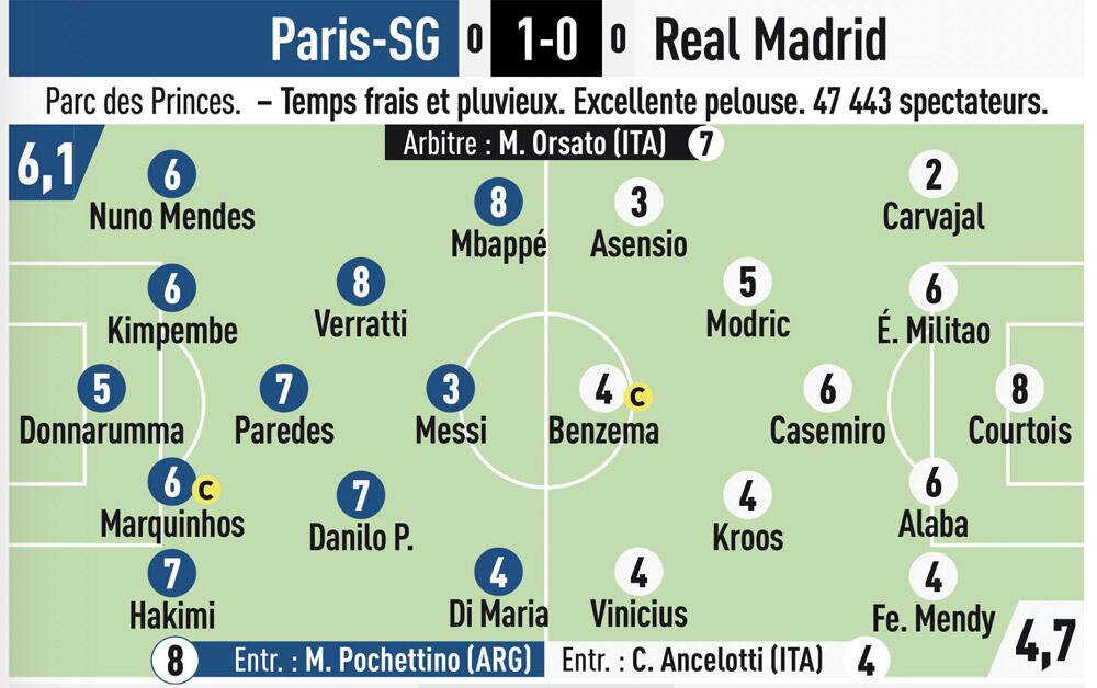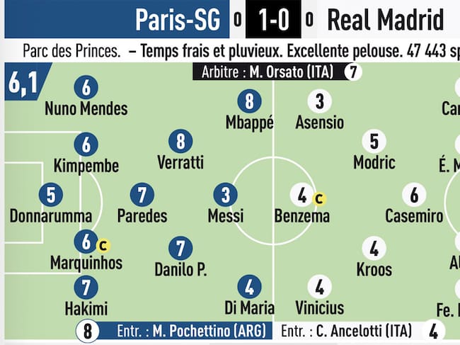 La cifra fue menor a la que le dieron a Karim Benzema y Vinicius Junior, quienes tuvieron, según el diario, una discreta actuación. Sin embargo, el peor calificado de la cancha fue Dani Carvajal, quien sufrió los estragos provocados por Kylian Mbappé en la banda derecha del Real Madrid.