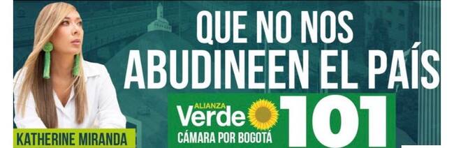 - En el primer lugar la de Katherine Miranda, candidata a la Cámara de Bogotá por el Partido Verde. Las vallas de la representante dicen: “¡Que no nos abudineen el país!”.