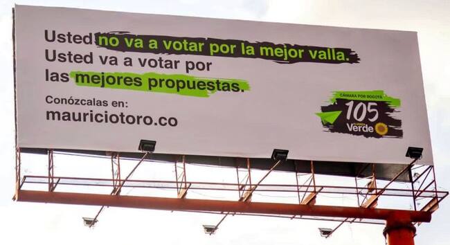 - En el número 10, una valla del candidato a la Cámara Mauricio Toro por el Partido Verde, con un amable recorderis : “Usted no va a votar por la mejor valla, usted va a votar por las mejores propuestas”.