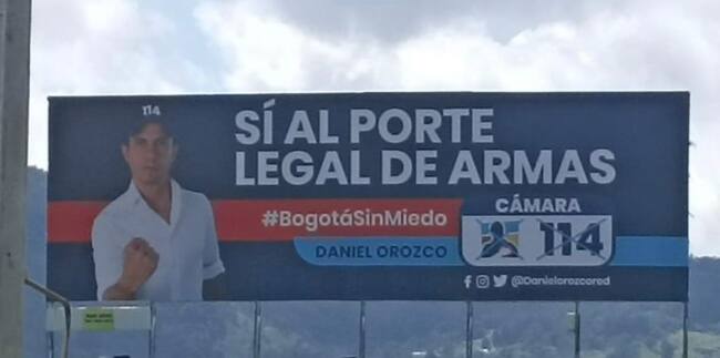 - La polémica valla de Daniel Orozco, candidato a la Cámara del Centro Democrático, que tajantemente le dice “Sí, al porte legal de armas”.