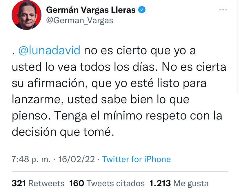 Críticas de Germán Vargas Lleras a David Luna en redes. Foto: @German_Vargas