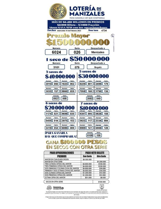 Entérese de los resultados del sorteo 4734 de la Lotería de Manizales de este 16 de febrero de 2022.