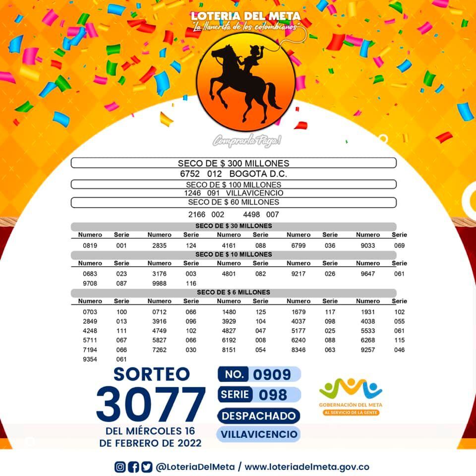 Entérese de los resultados del sorteo 3077 de la Lotería del Meta de este 16 de febrero de 2022.