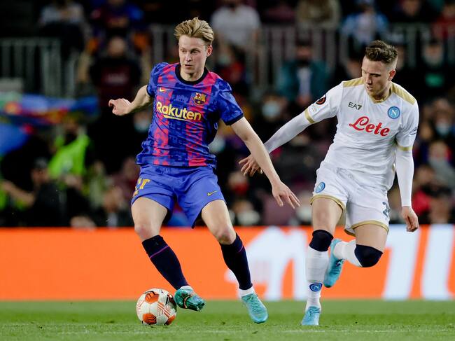 Frenkie de Jong del Barcelona disputando el balón con Piotr Zielinski del Napoli en la UEFA Europa League / David S. Bustamante/Getty Images