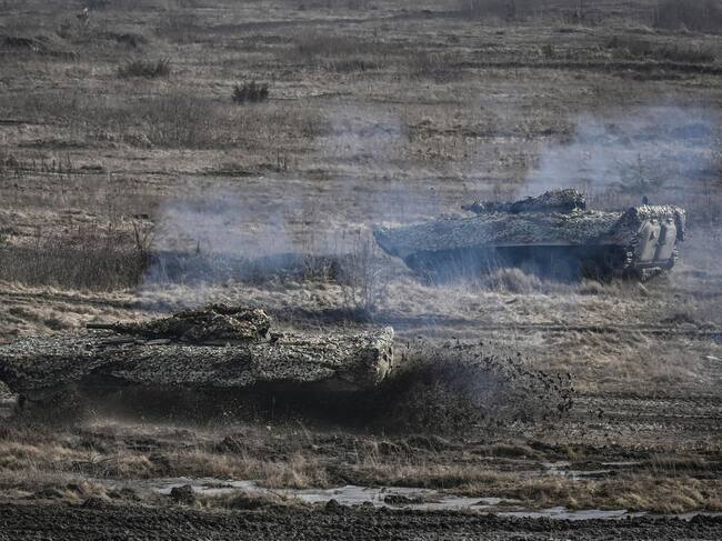 Ukrainian Army T-64 tanks take part in a military drill outside the city of Rivne, northern Ukraine, on February 16, 2022. (Photo by Aris Messinis / AFP) (Photo by ARIS MESSINIS/AFP via Getty Images) / ARIS MESSINIS