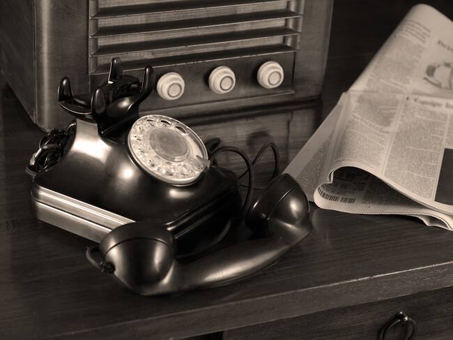 "Vintage scene with retro phone, radio and newspaper." / Maica