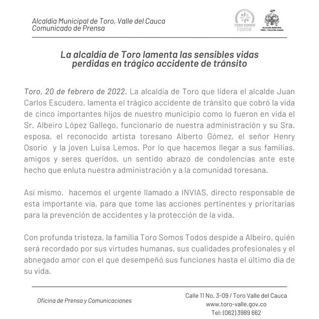Los fallecidos fueron identificados como Albeiro López Gallego, funcionario de la Alcaldía de Toro y su esposa, el artista local Alberto Gómez, el señor Henry Osorio y la joven Luisa Lemos.