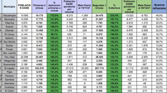 En total son 451 municipios que cumplen este porcentaje, entre ellos Yacuanquer en Nariño, El Cocuy en Boyacá, Salento en Quindio, Suárez en Tolima, Páramo en Santander y Envigado en Antioquia.
