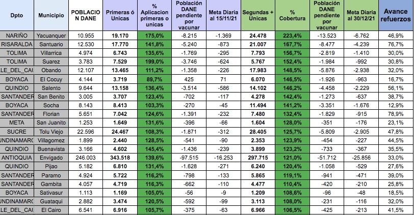 En total son 451 municipios que cumplen este porcentaje, entre ellos Yacuanquer en Nariño, El Cocuy en Boyacá, Salento en Quindio, Suárez en Tolima, Páramo en Santander y Envigado en Antioquia.