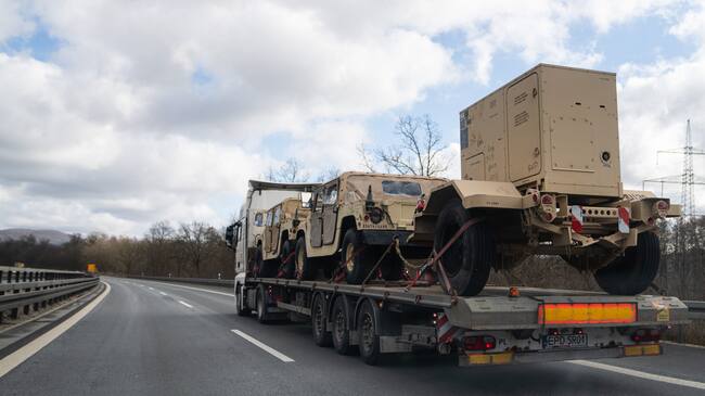 25 February 2022, Bavaria, Stadelhofen: A truck with Polish license plates is transporting several U.S. Army Humvee vehicles on the A70 toward Bayreuth. Photo: Nicolas Armer/dpa (Photo by Nicolas Armer/picture alliance via Getty Images) / picture alliance