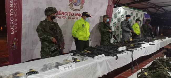 En el lugar, tropas del Ejército incautaron explosivos, comunicaciones e intendencia, conformado por 2 ametralladoras, 21 fusiles, dos lanzagranadas, un mortero, 8 pistolas, abundante munición de diferente calibre, 62 proveedores, 6 artefactos explosivos improvisados, 53 granadas, uniformes camuflados, computadores, discos duros, memorias y celulares.