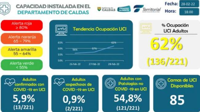 Carlos Iván Heredia, director de la Dirección Territorial Salud, manifestó que, de las 221 camas UCI hay ocupadas 136 que es el 62%.