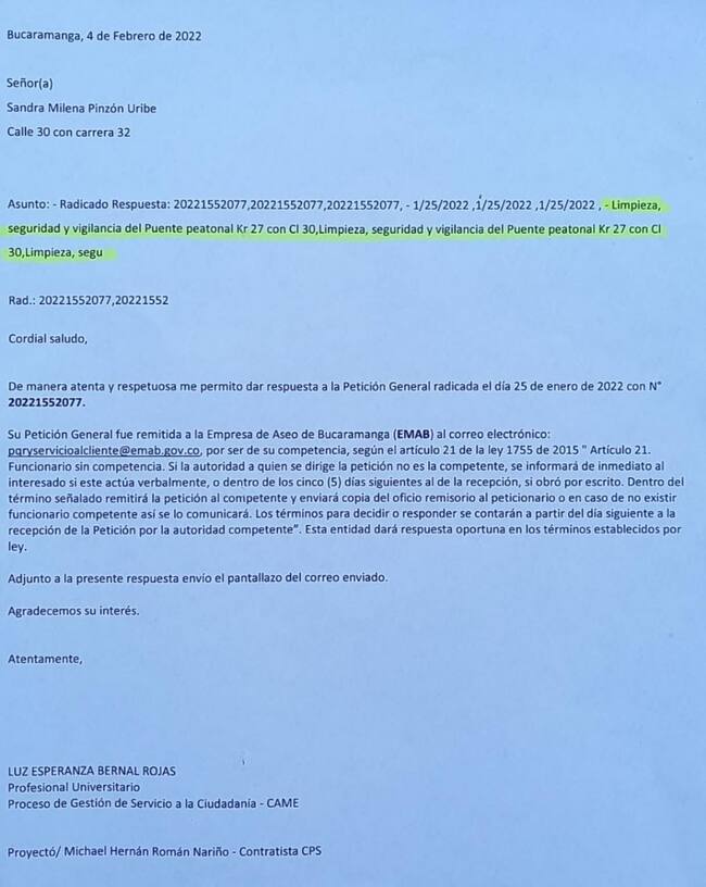 El 25 de enero del 2022, un mes exacto antes del atraco a la estudiante de la Normal Superior, se radicó una carta a la Alcaldía de Bucaramanga, en el que se pedía limpieza en el túnel y puente peatonal del Mesón de los Búcaros, ya que los habitantes de calle realizan sus necesidades fisiológicas en el lugar.