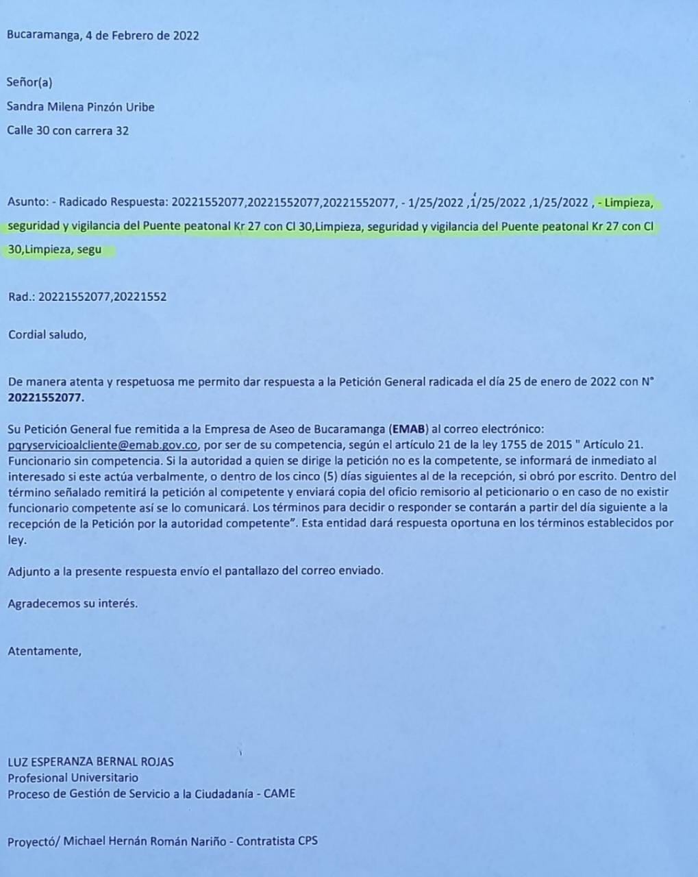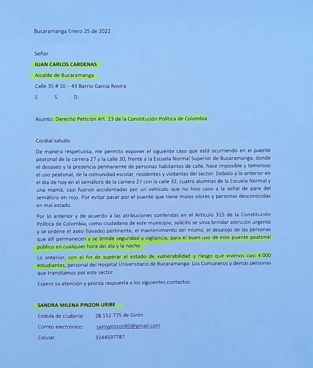 El 25 de enero del 2022, un mes exacto antes del atraco a la estudiante de la Normal Superior, se radicó una carta a la Alcaldía de Bucaramanga, en el que se pedía limpieza en el túnel y puente peatonal del Mesón de los Búcaros, ya que los habitantes de calle realizan sus necesidades fisiológicas en el lugar.