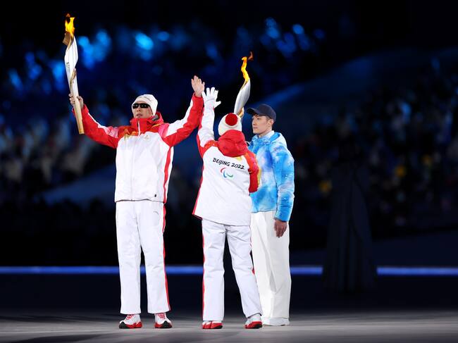 BEIJING, CHINA - MARCH 04: Torchbearers carry the Olympic flame during the Opening Ceremony of the Beijing 2022 Winter Paralympics at the Beijing National Stadium on March 04, 2022 in Beijing, China. (Photo by Lintao Zhang/Getty Images) / Lintao Zhang