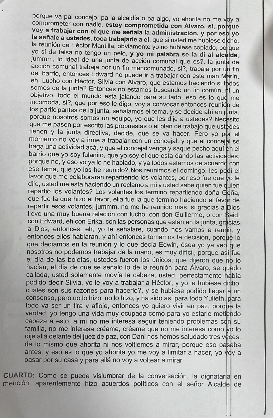 "Estoy comprometida con Álvaro, sí, porque estoy comprometida, con quien me señala la administración y por eso le señalé a ustedes, toca trabajar con el, yo mí palabra se la di al alcalde, los de una junta de acción, qué es, trabaja con un fin mancomunado, Edward no puede trabajar con uno y con otro, qué estamos haciendo, no estamos buscando un fin objetivo, eso me incomoda, voy a convocar reunión. y señalamos el tema y se decide, necesito que me pasen por escrito y la junta decide qué se va a hacer".