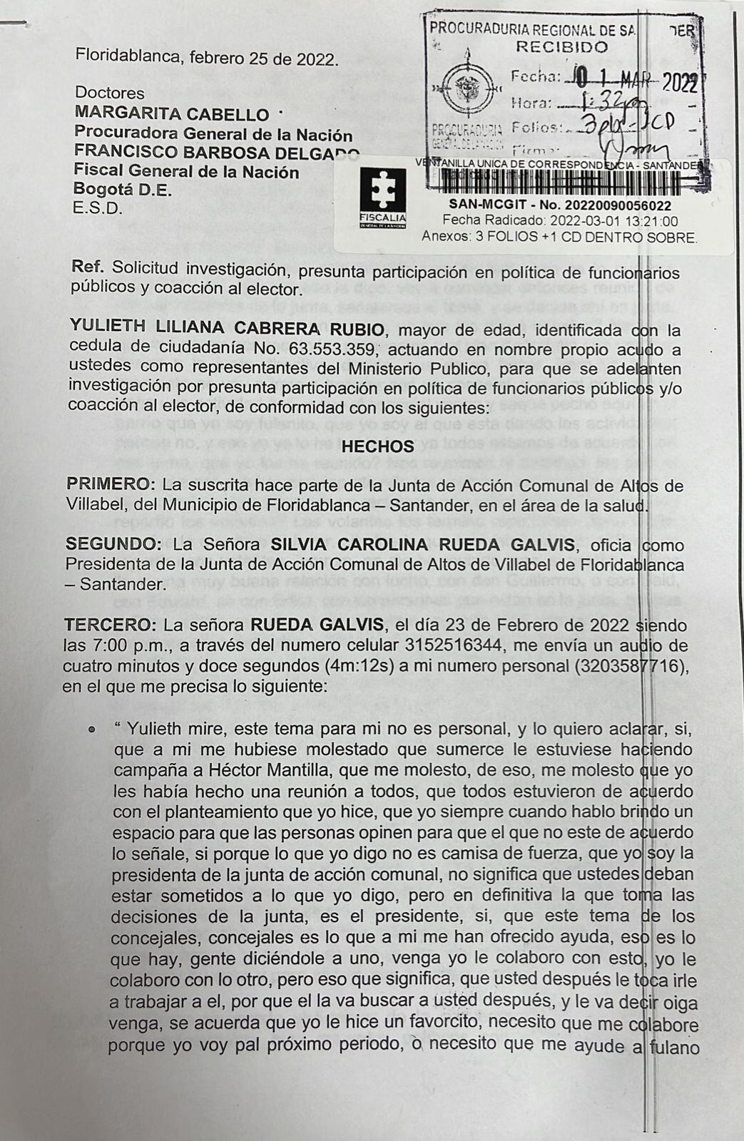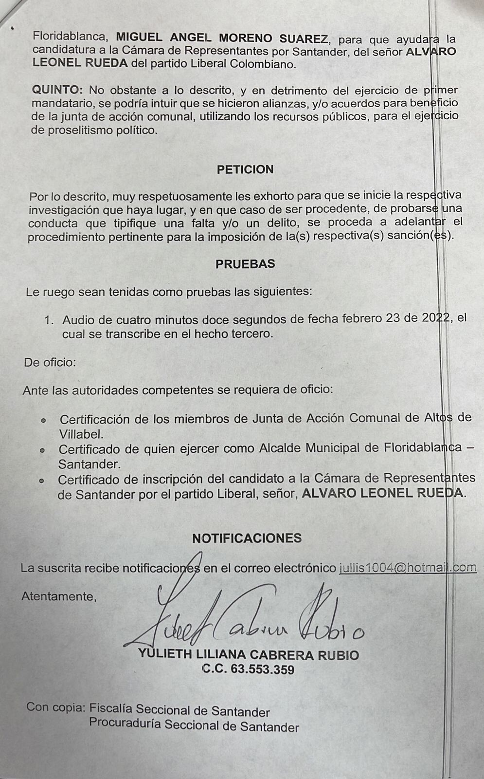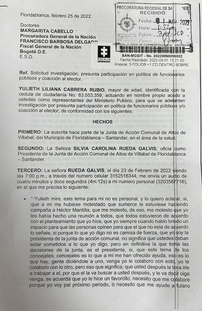 Julieth pidió a Fiscalía y Procuraduría que se investigue por presunta participación en política y y coacción electoral, basándose en que Silvia Carolina Rueda, presidente de la junta, le envió un mensaje de voz, de más de cuatro minutos hablando de por quien debería votar y que todo el grupo de la junta, debería ir por solo un candidato como lo ha solicitado la Alcaldía de Floridablanca.