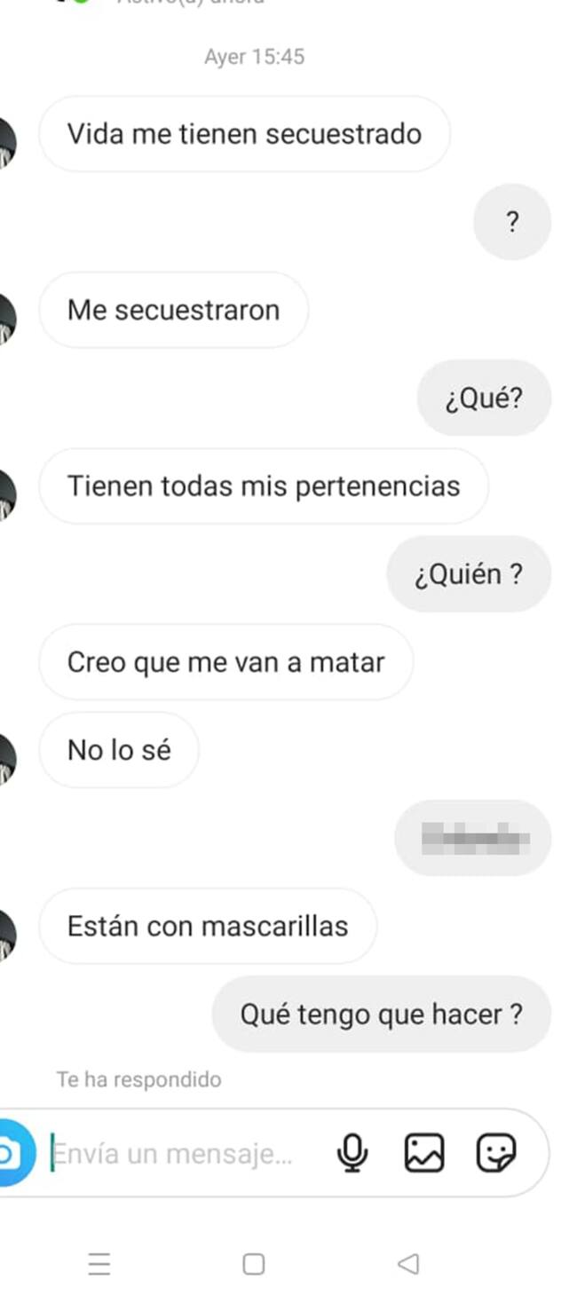 - Vida me secuestraron. Me secuestraron. Tienen todas mis pertenencias. Creo que me van a matar. No lo sé. Están con mascarillas
