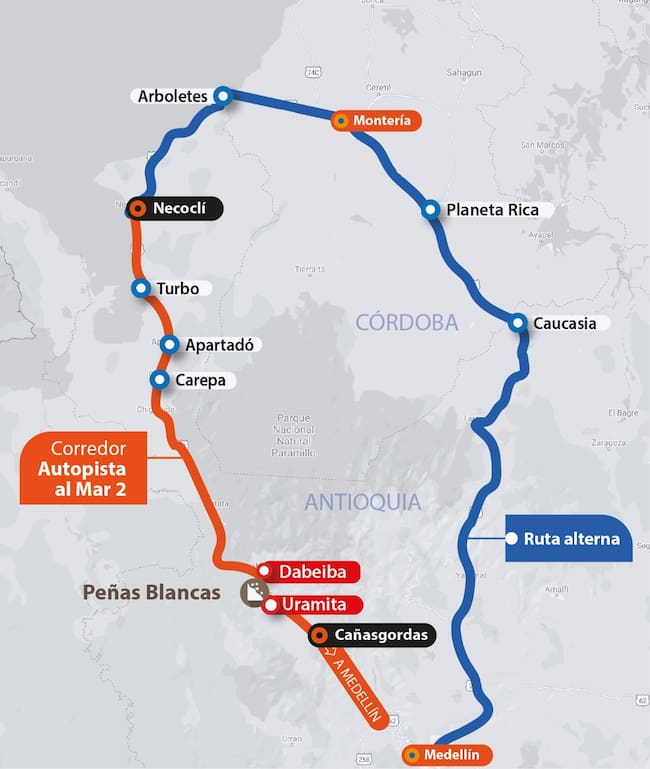 Las autoridades de tránsito recomiendan como vía alterna el paso por Medellín – Caucasia – Planeta Rica – Arboletes – Apartadó, para llegar al Urabá Antioqueño.