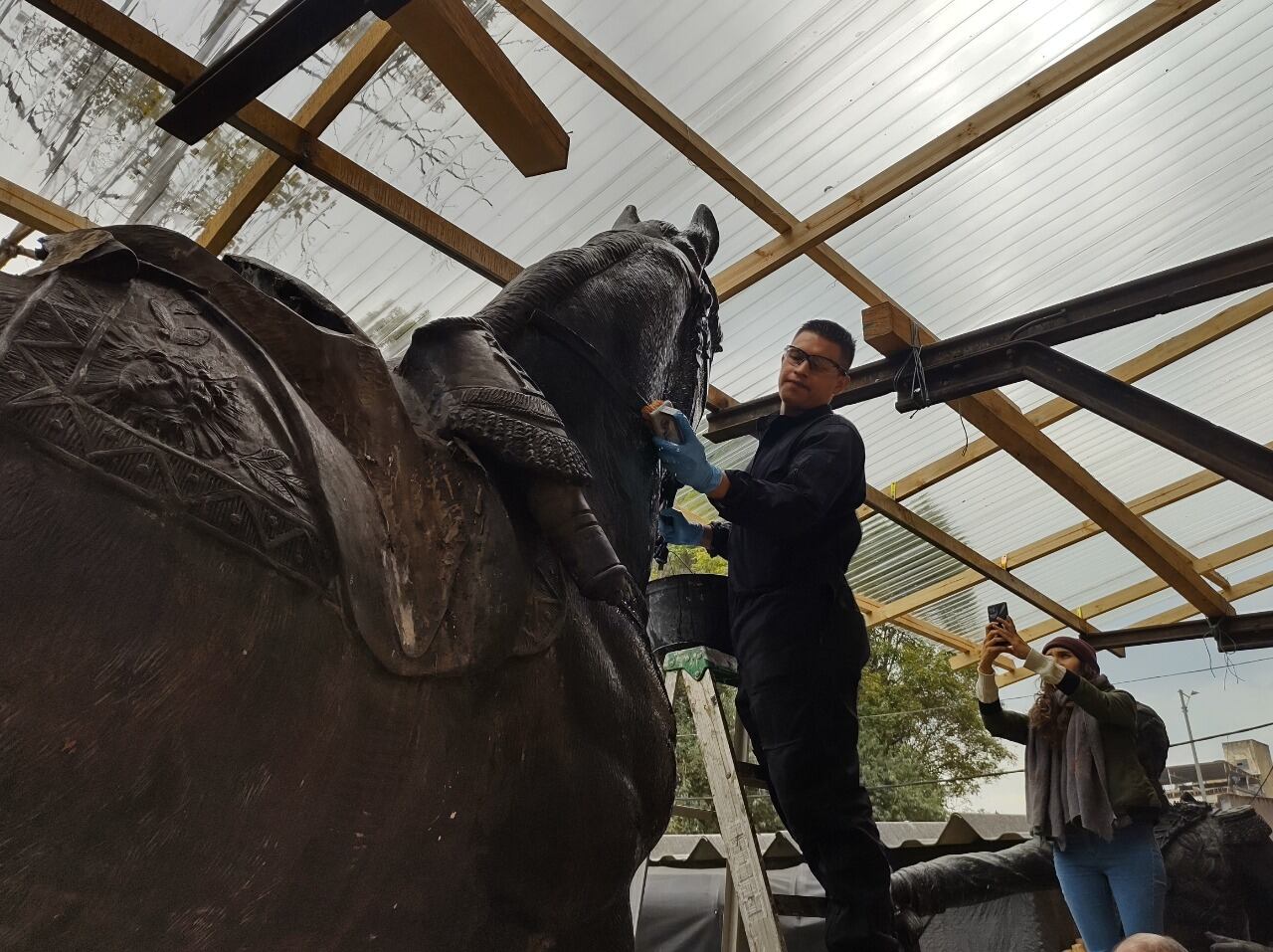 “La intervención consistió en separar la figura de Bolívar de su caballo para intervenir de manera independiente cada una de ellas. El procedimiento fue desarrollado en uno de los espacios de la Fundación Escuela Taller Naranja de Bogotá, en la Estación la Sabana, donde la escultura permanece bajo custodia del Ministerio de Cultura”.