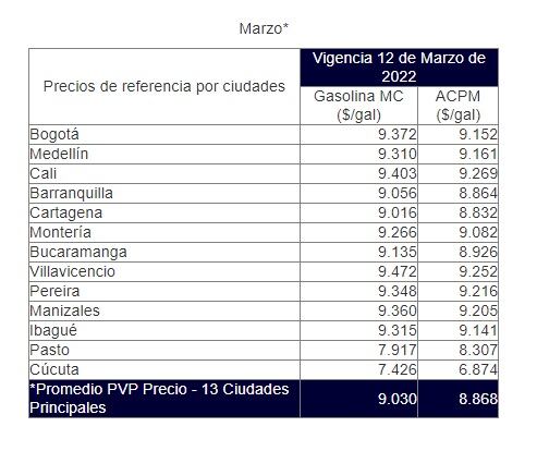 En la siguiente tabla, el Ministerio de Minas y Energía relacionó los precios que seguirán rigiendo en el país a partir de este 12 de marzo en las principales ciudades: