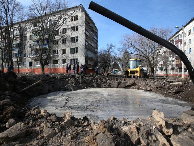 Communal services deal with consequences of what is said was an explosion of a ballistic missile in a residential area in Kramatorsk on March 14, 2022, following an overnight shelling amid the ongoing Russia's invasion of Ukraine. - The shelling killed 2 civilians, according to the local mayor. (Photo by Anatolii Stepanov / AFP) (Photo by ANATOLII STEPANOV/AFP via Getty Images) / ANATOLII STEPANOV