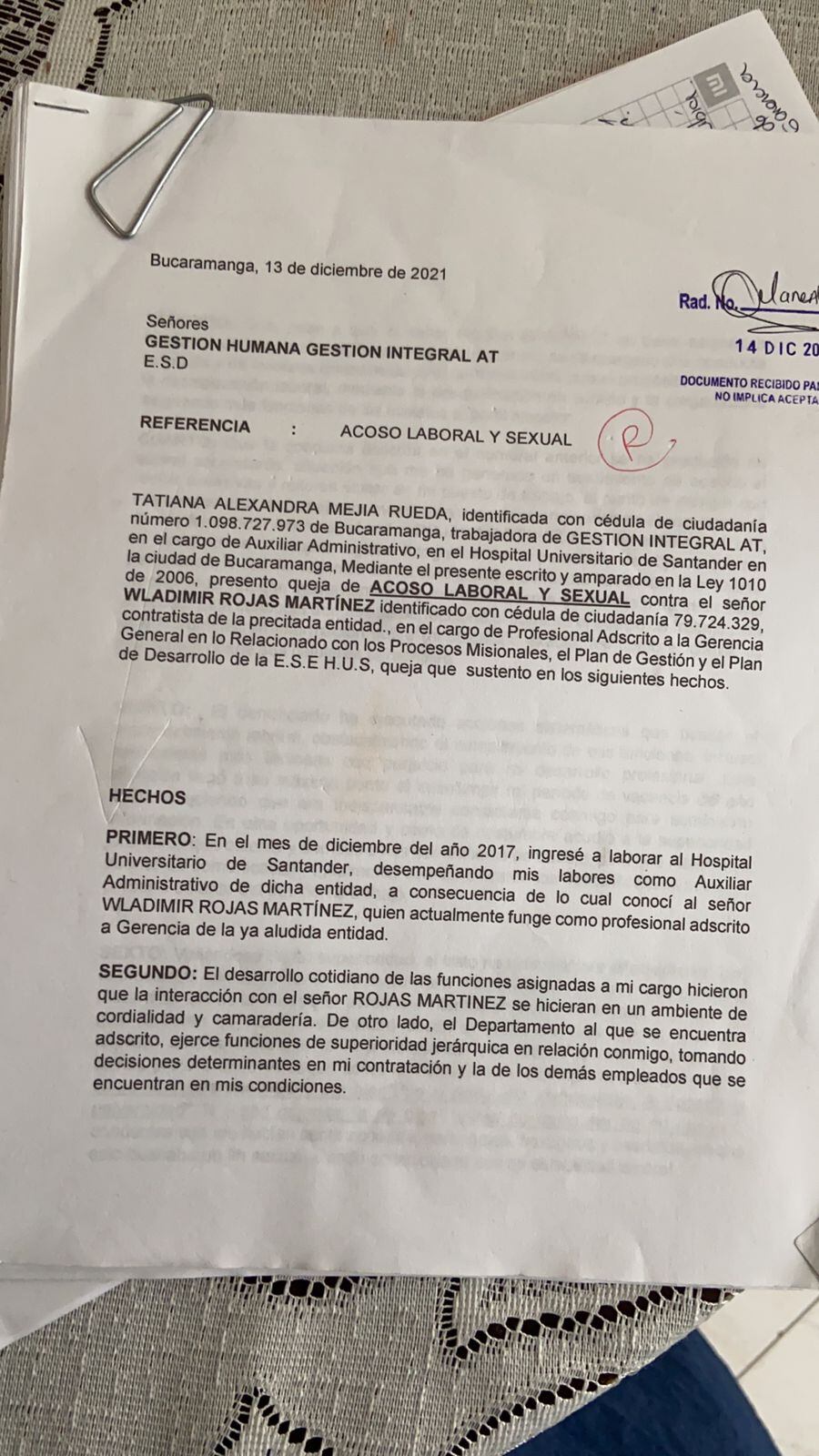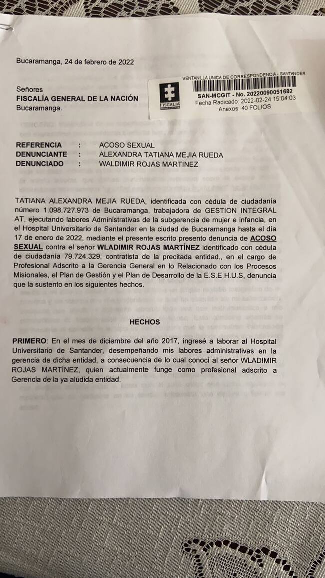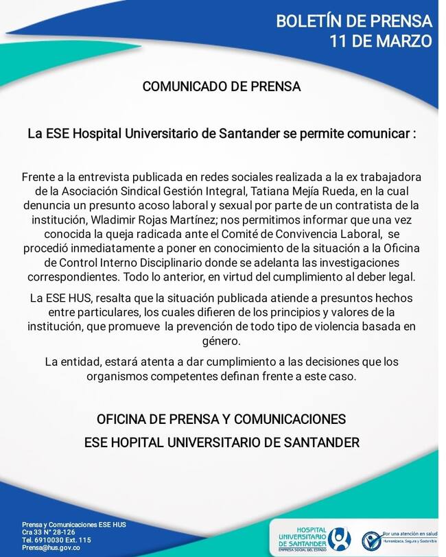 Tatiana Mejía, ex trabajadora del área de ginecología del Hospital Universitario de Santander, HUS, denunció ante la Fiscalía que fue presuntamente acosada sexualmente y laboralmente por parte del asesor del gerente de la entidad, Wladimir Rojas Martínez. Explicó que el acoso comenzó hace tres años cuando su relación inició con una amistad, pero, el implicado comenzó a persuadirla con otras intenciones e intimidarla con mantenerla en su cargo si accedía a algo más que una relación laboral.