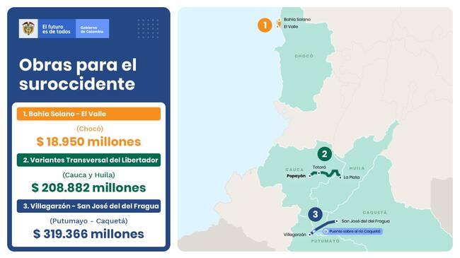 De esta manera yendo al detalle, para la movilidad del suroccidente del país, la entidad adjudicó, en 2 módulos, obras que se enmarcan en el programa de Reactivación 2.0 del gobierno nacional y que benefician a los departamentos de Cauca, Huila y Chocó con inversiones totales por 227.832 millones de pesos.