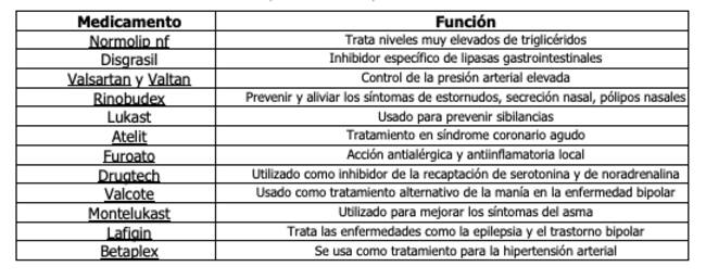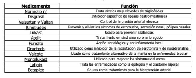 Algunos de esos son Valsartan, que controla la presión arterial elevada, o Montelukast, utilizado para mejorar los síntomas del asma.