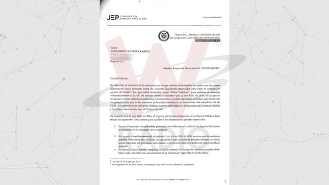Sigue La W revela en exclusiva la carta de dos páginas que Luis Jhon Castro Ramírez, conocido como ‘El Zarco’ y señalado de ser el eslabón perdido del tenebroso capítulo de las ejecuciones extrajudiciales conocidas como ‘falsos positivos’, le escribió con su puño y letra a la Jurisdicción Especial para la Paz (JEP), pidiéndole pista para romper su silencio y confesar su participación en el asesinato de civiles que fueron presentados como guerrilleros por parte de militares.