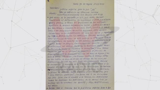 “Se conocerán ‘nombres de personas del Ejército y del Estado ¿Qué desaparecieron de la única declaración del año 2010 ante la Fiscalía 23 de Cali y otras personas con responsabilidad que no se han nombrado ni detenido por su responsabilidad directa?”, se lee en la carta de sometimiento ante la JEP.