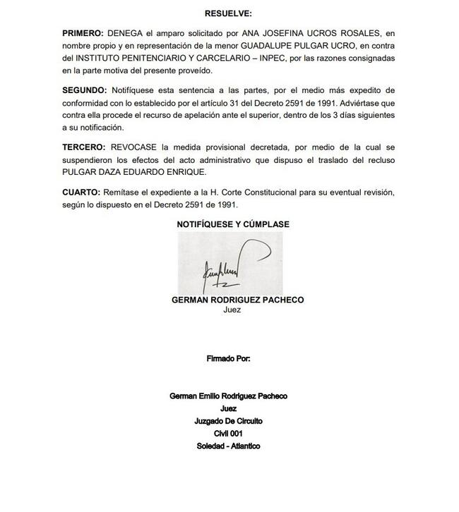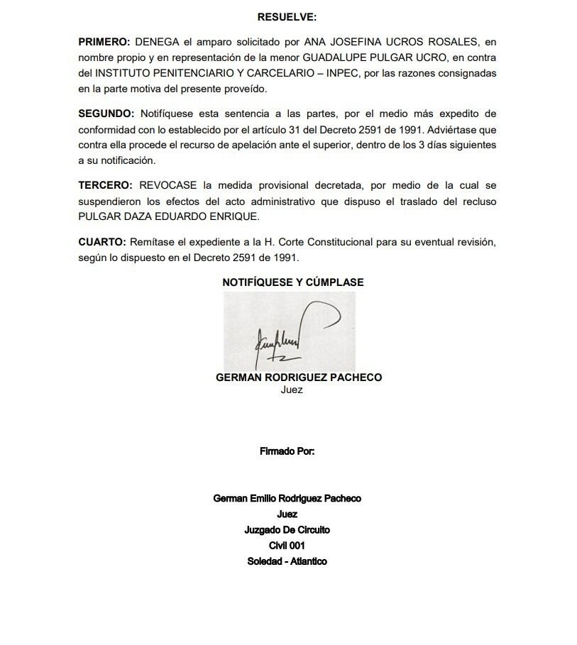 Después de que la pareja sentimental del exsenador de Eduardo Pulgar interpusiera una acción de tutela que evitó el traslado del condenado a la cárcel La Picota de Bogotá, el Juzgado primero Civil de Soledad resolvió el recurso donde se reclamaba la protección del derecho fundamental y la unión familiar del sindicato por tener arraigo en el departamento del Atlántico.