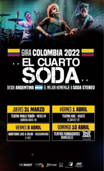El próximo 31 de marzo, Medellín podrá ver en vivo a ‘El Cuarto Soda’ en el Teatro Pablo Tobón; el viernes 1 de abril será el turno para la ciudad capitalina, Bogotá, en el Teatro ABC. Por su parte, los fanáticos de Bucaramanga, podrán disfrutar el show el 8 de abril en el Auditorio Luis A. Calvo, y por ultimo, Manizales tendrá que alistarse para el 10 de abril, pues el show rockero tendrá lugar en el Teatro Fundadores.