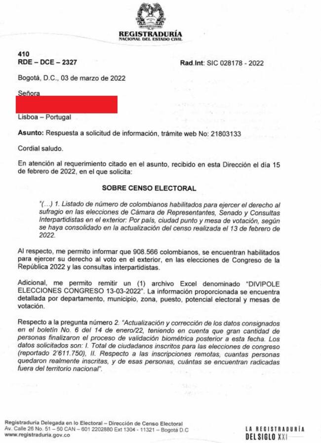 Además de ese caso, se conoció que una ciudadana en Portugal llamada Katherine Benavides interpuso un derecho de petición para conocer el número de ciudadanos que lograron la inscripción.
