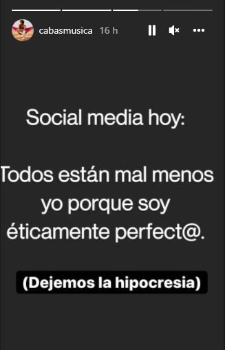 “Social media hoy: ‘Todos están mal menos yo porque soy éticamente perfect@’. Dejemos la hipocresía”, fue el mensaje que dejó Cabas.