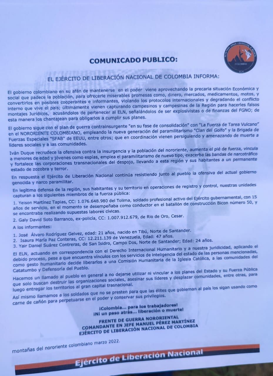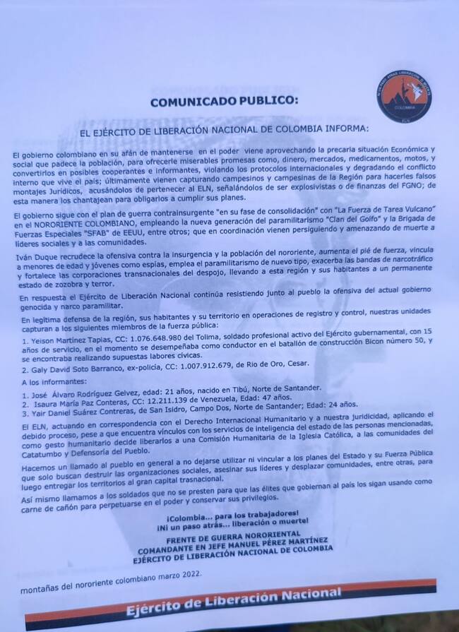 Entre los liberados se encuentra el soldado profesional Yeison Martínez Tapia, quien fue secuestrado el pasado tres de noviembre del año 2021, cuando cumplía una labor humanitaria, la entrega de agua a la población vulnerable del municipio de Tibú, Norte de Santander.