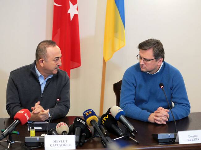 El ministro de Relaciones Exteriores de Turquía, Mevlut Cavusoglu (izquierda), y el ministro de Relaciones Exteriores de Ucrania, Dmytro Kuleba, (Photo by Alona Nikolayevych/Ukrinform/NurPhoto via Getty Images) / Alona Nikolayevych