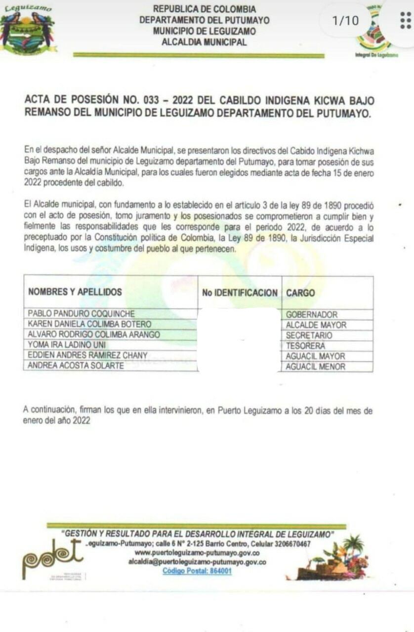 Sigue La W también conoció que ante el despacho del alcalde del municipio de Leguízamo se presentaron los directivos del Cabildo Indígena Kichwa Bajo Remanso para tomar posesión de sus cargos para los que fueron elegidos el pasado 15 de enero de 2022. A continuación el documento: