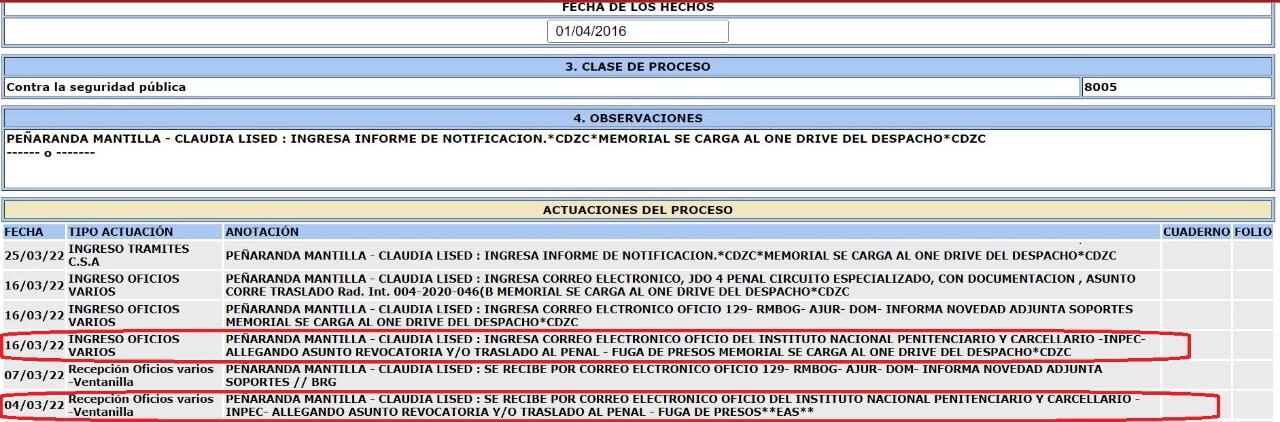 El Inpec reportó al juez de Ejecución de Penas que Peñaranda no se encuentra en su lugar de detención.