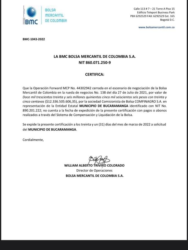 “No ha pagado ni un peso al contratista encargado de la telegestión hasta que las luminarias no estén totalmente telegestionadas. Es una ventaja de la @BolsaMercantil para asegurar el cumplimiento”, dijo César Castellanos, secretario administrativo de Bucaramanga, vía Twitter.