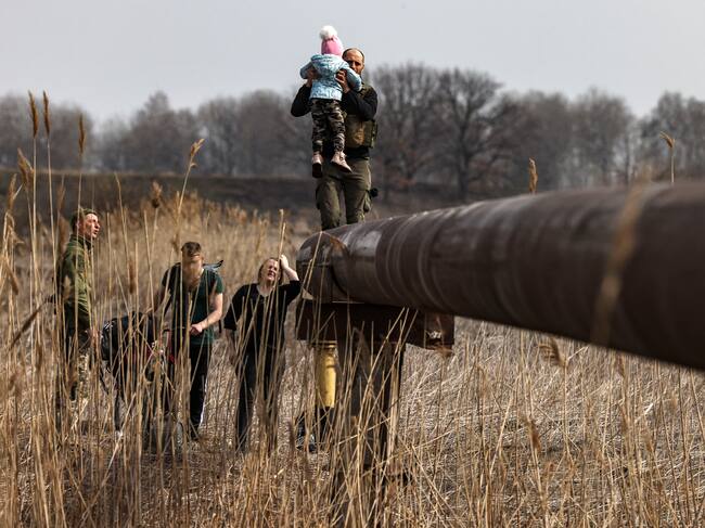 Ukrainian soldier Andriy carries the baby of a displaced family to help to cross a river, on the outskirts of Kyiv, on March 31, 2022. - Russian forces are repositioning in Ukraine to strengthen their offensive on the Donbass, Nato said March 31, 2022, on the 36th day of the Russian-Ukrainian conflict, as shelling continues in Kharkiv (north) and Mariupol (south). (Photo by RONALDO SCHEMIDT / AFP) (Photo by RONALDO SCHEMIDT/AFP via Getty Images) / RONALDO SCHEMIDT